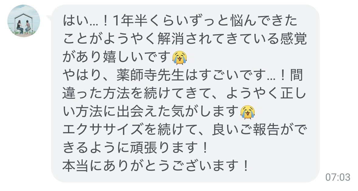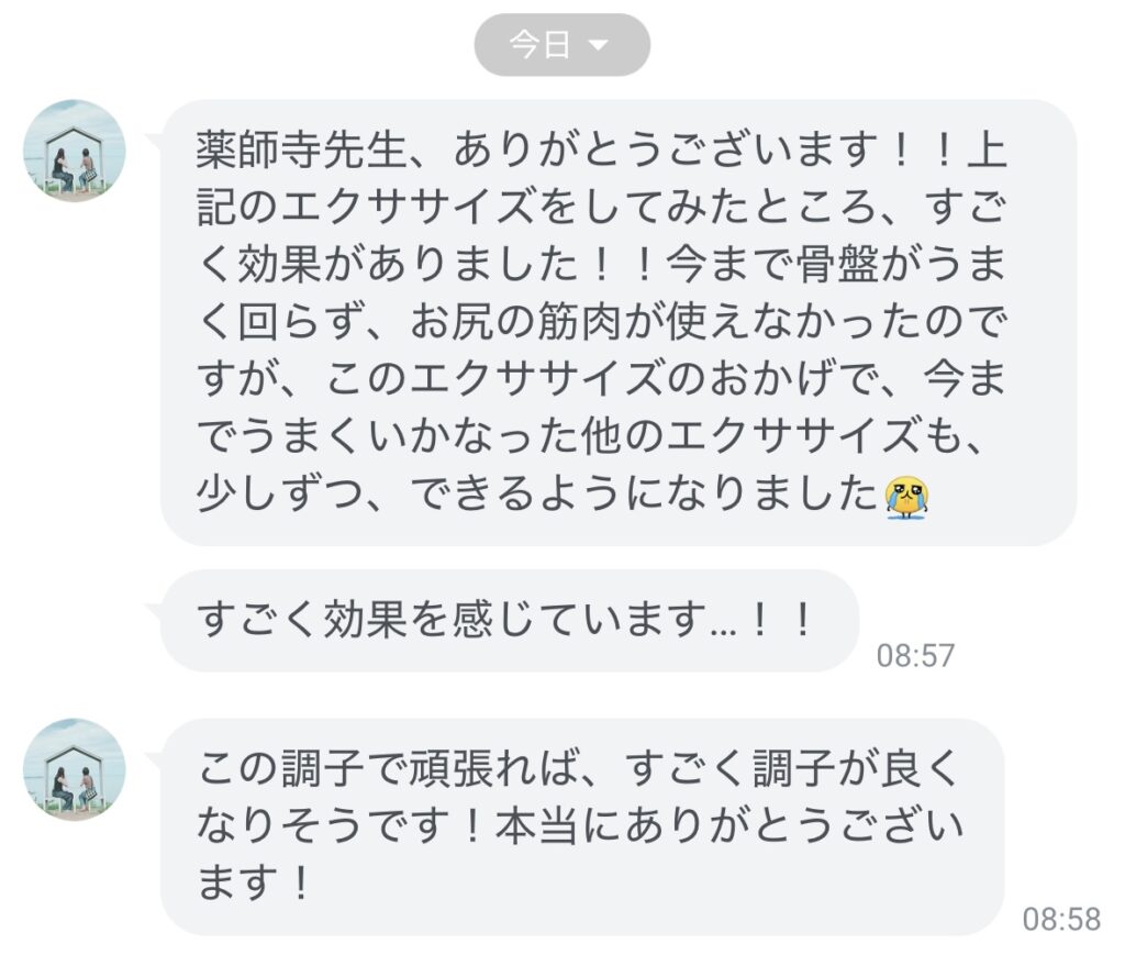 この方もアドバイス・セルフケアの方向性をお伝えして2ヶ月程度ですが、セルフケアの継続で姿勢改善や呼吸の深さなど変化を実感されています(この方も課題はまだありますが、不調改善が出来ている方も多数です)