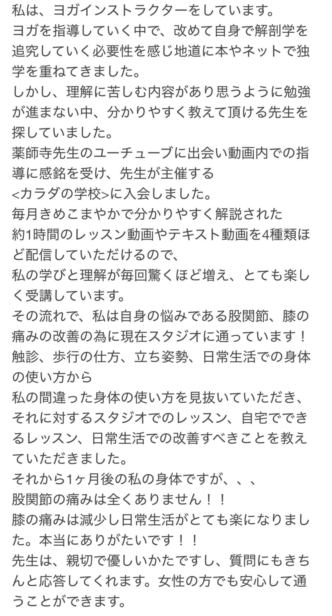 身体を良くするために必要な科学的根拠がある正しい情報を届けたいという想いがあります。そして、その科学的根拠を踏まえて、実際に自分自身が現場でお客様にも実践しているエクササイズ・トレーニング・セルフケアなどの実践方法を分かりやすくオンライン配信しています。一緒に気持ちよく運動したい人・やった感だけが出るエクササイズをしたい人にはあまり向かないサロンですが、「痛み・動き・姿勢」の改善などや長期的に健康的な身体でいるための正しい知識・実践方法を身に付けたいという目的の方には是非ご活用して頂きたいサービスになっています。カラダの学校へのご参加を心よりお待ちしています。